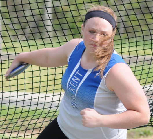 New Kent's Caitlin McClain spins into her throwing motion on the way to winning discus with a toss of 96-10.