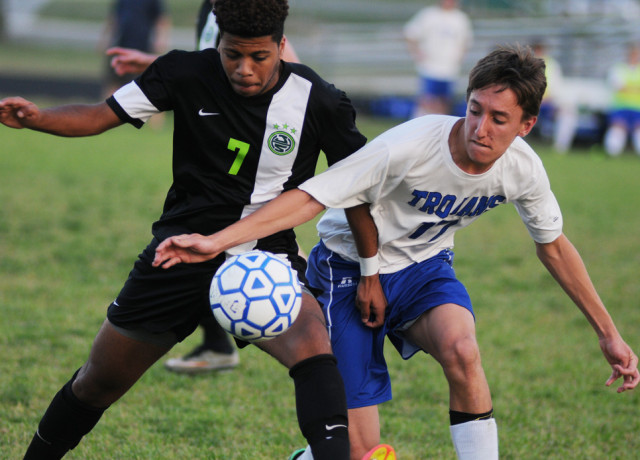 Four minutes later, however, the Eagles’ Jeff Wolons evened the affair. Shortly after Wolons’ score, New Kent’s Joey Clark came close to putting the Trojans back in front, but his shot from in front of the Eagle goal sailed high. Unfortunately for the hosts, Clark’s shot would be the Trojans’ last of the half.