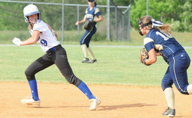 Lady Trojan base runner Peyton Slater bolts toward third base, glancing back to spot Lafayette shortstop Brie Gillen in pursuit. Slater got caught in a rundown between second and third and eventually was tagged out.Alan Chamberlain photo