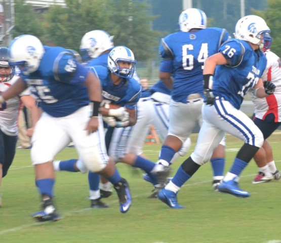 New Kent fullback Lamont Brandon (carrying ball) gets a royal escort of protection thanks to blocking from teammates Josh Dixon (64), Joe Dixon (65), and Dean Powell (76).