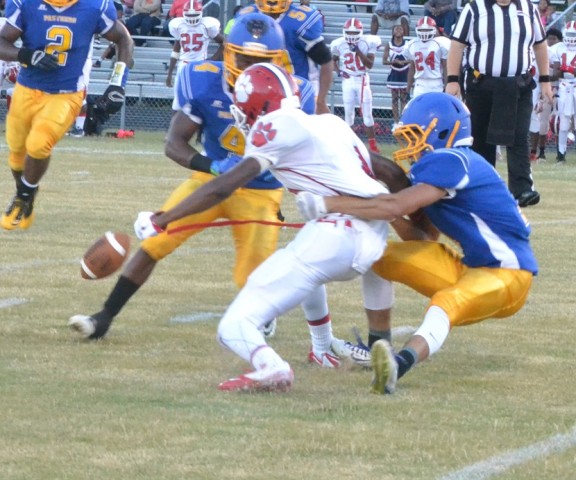 Charles City defensive back Kyle Jones (right) pulls down Sussex Central wide receiver Tyrese Hill, causing a fumble as teammate Mason Jefferson (4) comes in to aid. Charles City would recover the fumble.