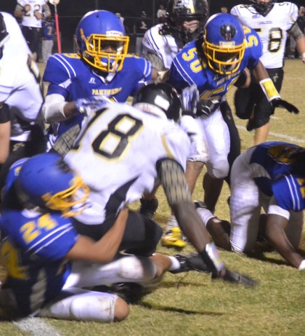 Charles City's Tyler Allen (24) drags down hefty running back Lafayette Pendleton as teammates Brian Hicks (9) and Andre' Mason (50) close in to assist.