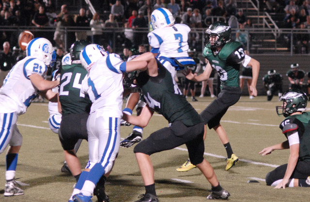 But a holding call nullified the Eagle score. On the next play, Reeders recovered an Eagle fumble, setting up a five-play, 60-yard scoring drive highlighted by Burt’s 36-yard gain on a quarterback keeper. Burt then burrowed into the end zone behind his line on a one-yard plunge to close the gap to 7-6.