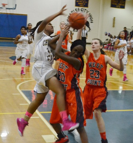 Charles City freshman Santaesha Hickman converted two baskets from the charity stripe to return the margin to single digits (21-12), but the visiting senior duo use a combination of high post-low post passing to get behind the Lady Panthers zone. The end result was 12 more points from the pair and a 37-14 lead heading into the fourth. And even when West Point’s top scoring threats sat in the fourth quarter, reserve players for the Lady Pointers maintained and increased the lead for the visitors.