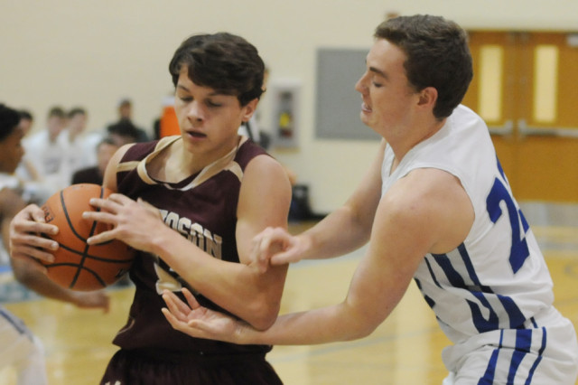 New Kent's Darren McCaughan (right) reaches for a steal attempt while Poquoson's Tucker Schuhart struggles to maintain control of the ball.Alan Chamberlain photo