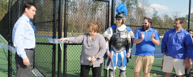 New Kent School Board member Gail Hardinge performs the honor of officially opening New Kent High School's new tennis courts by cutting a ceremonial ribbon Thursday afternoon as a prelude to the first match on the six courts pitting New Kent's girls tennis team against Essex. Joining in the event are school superintendent Dave Myers (left), school mascot Troy the Trojan, girls tennis coach Matt Duckworth, and athletics director John Spiak.Alan Chamberlain photo