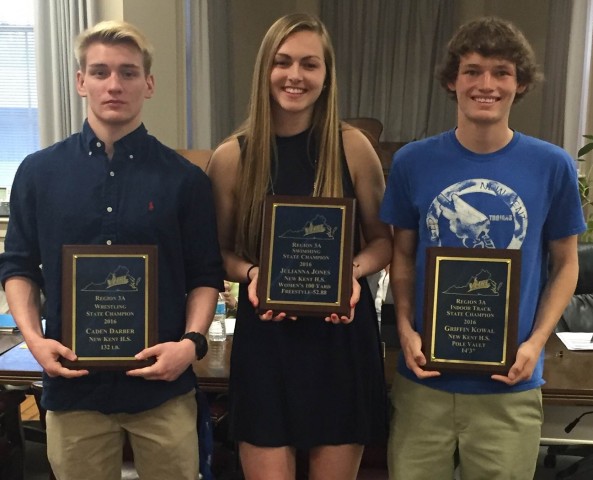 New Kent High School athletes (l to r) Caden Darber, Julianna Jones, and Griffin Kowal were recognized during Monday night's New Kent school board meeting for their accomplishments at the state level. Darber (wrestling), Jones (swimming), and Kowal (indoor track) were all winners in their respective events in state competition.