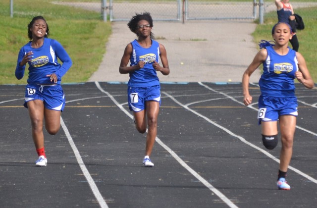 Charles City's Shanijah Brown (right) accelerates out the curve of the girls' 200 meter dash as teammates Dayonna Henderson (center) and Jaelah Wyatt (left) trails close behind. Brown finished 3rd in the event, with Henderson finishing 8th and Wyatt 10th.