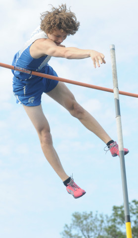 New Kent's Griffin Kowal soars over the bar at 14 feet, six inches to win the pole vault title at the Colonial Conference 25 track meet.Alan Chamberlain photos