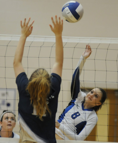 Lady Trojan Mattie Thornton spikes over the blocking attempt by Lafayette's Abby Oren.Alan Chamberlain photo