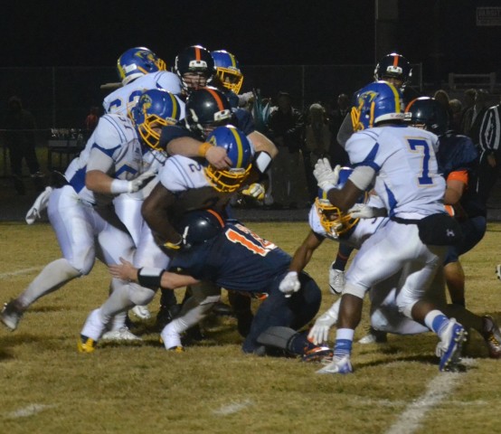 Not even a gang tackle by West Point's Jared Lawson (12) and Noah Lawson (back) can slow down Charles City's Cecil Tyler (2) as teammates Richard Adkins (51) and Troy Crawley (7) provide additional escort for the back.Andre' Jones photo