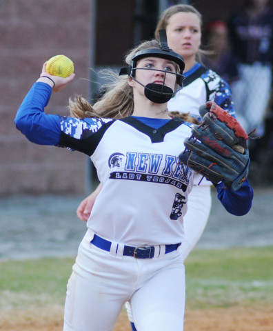 New Kent pitcher Abigail Young fires to first for an out after fielding a slow roller in the fifth inning.