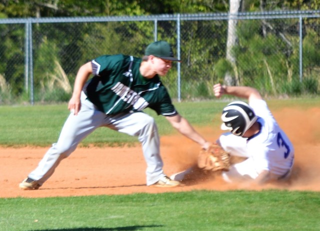 New Kent's Austin Connolly (3) slides safely into scond base under the tag of a Jamestown player.