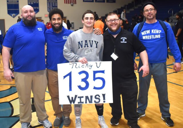 New Kent High School senior and Navy bound wrestler Nick Vafiadis (center) racked in win number 135, putting himself in an elite club during the Group 3A Region A championships Saturday afternoon.Robb Johnson photo
