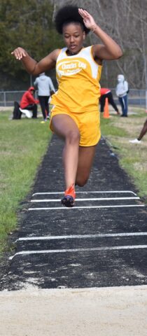 Charles City’s Surayyah Tinsley takes flight in the girls’ long jump competition at the Charles City Invitational Saturday morning.Robb Johnson photo