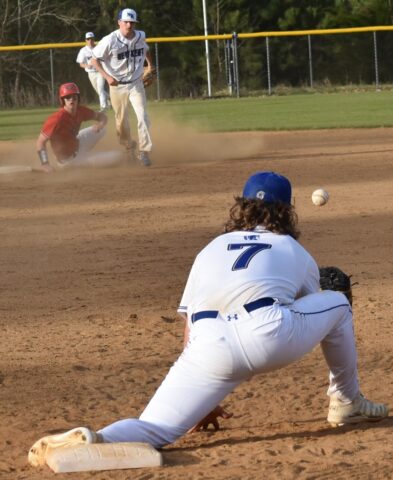New Kent’s Nick Redman (7) stretches out to haul in a throw from teammate Daniel Colgin (background) as the duo completes a double play.Robb Johnson photo