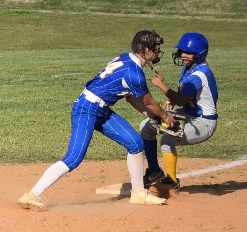 Charles City’s Janiya Washington (right) is able to reach third base before a tag is applied by a Mathews’ player.
