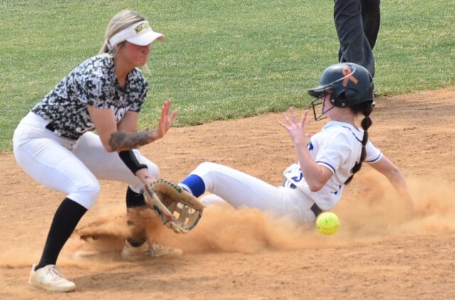 New Kent pinch-runner Sydney Eubank (right) steals second base successfully in the bottom of the seventh inning.