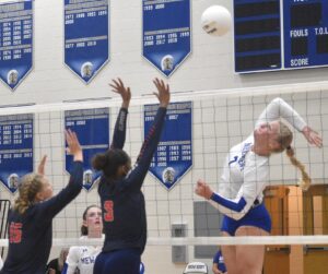 New Kent’s Leah Rounds (right) winds up to deliver akill while being challenged by Grafton’s Ana Breckons (15) and Alana Washington (3).Robb Johnson photo