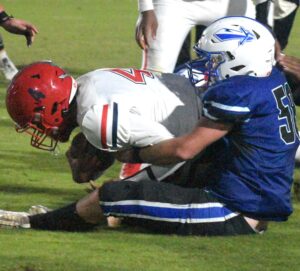 DSC_0658 By Andre Jones | September 21, 2024 11:54 pm New Kent defensive lineman Ryan Bacelar (58) wraps up Grafton quarterback X’zavieon Hendricks during a scramble in the first half.Robb Johnson photo