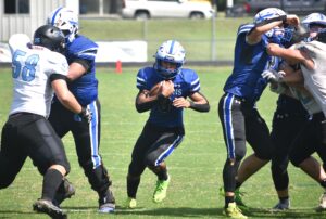 New Kent’s Nathaniel Christian (3) finds a gaping hole to run through thanks to key blocking from teammates Chase Wiles (2) and Tristen Jenkins (left).
