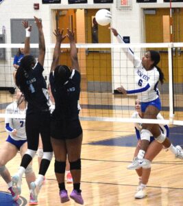 DSC_0588 By Andre Jones | November 6, 2024 10:09 pm New Kent’s Ryan Griffith (6) looks like she is walking on air as she delivers a kill over two Lakeland defenders.Robb Johnson photo