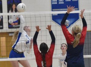 New Kent’s Ava Nieto (2) is quick to the punch as she delivers a kill before Lady Colonial defenders could block it.