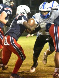 DSC_1084 By Andre Jones | November 17, 2024 12:24 pm New Kent’s Sherman Wynn (8) darts to the whole to bring down Colonial Heights’ running back Keyon Ridley (4).Robb Johnson photo