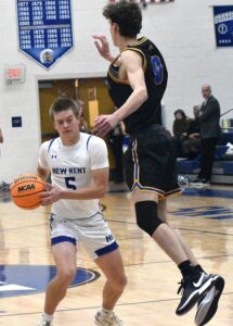 DSC_0620 By Andre Jones | December 5, 2024 9:18 am A pump fake by New Kent’s Kyle Diggs (5) baits Western Albemarle’s Grey Clifford into a block attempt, allowing Diggs to escape.Robb Johnson photo