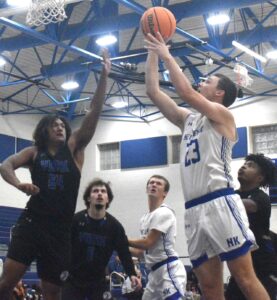 DSC_0093 By Andre Jones | December 13, 2024 6:40 am New Kent’s Michael Hetzel (23) drops in a shot over a York defender.Robb Johnson photo