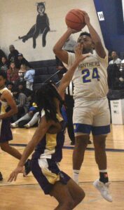 DSC_0659 By Andre Jones | January 5, 2025 4:56 pm Charles City’s Terrell Crawley (24) knocks down a game-tying jump shot over the outstretched hand of Essex’s Arek Ashlock.Robb Johnson photo