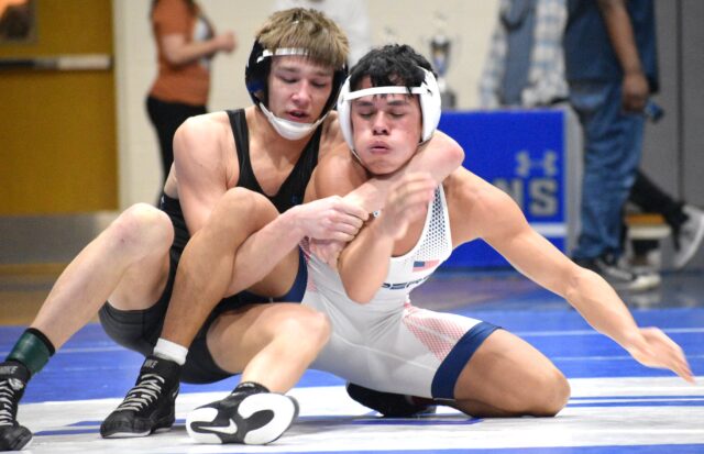 DSC_0990 By Andre Jones | February 17, 2025 11:11 pm New Kent’s Noah Cuic (left) locks in a grapple against Grafton’s Gregory Campbell, eventually winning the 138-pound division weight class.