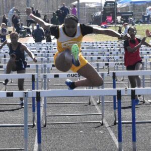 Charles City's Derequa Johnson easily glides across the hurdle en route to winning her heat of the girls' 100-meter hurdles. She finished second overall in the event.Robb Johnson photo