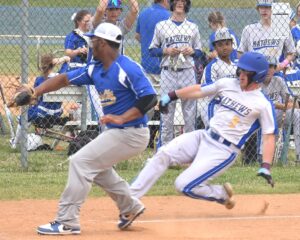 Charles City’s James Harris IV (left) snags the ball and attempts to tag Mathews’ baserunner Christian Blue (9) at home plate. The runner was deemed safe on the play.Andre' Jones photo