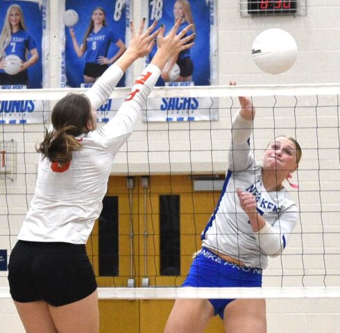 New Kent’s Leah Rounds (right) delivers a kill despite a block attempt by Tabb’s Haley Atkins (left).