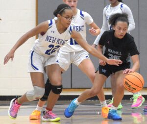 New Kent’s Rayne Otey (22) attempts to steal the ball from Warhill’s Alana Sewer (25).