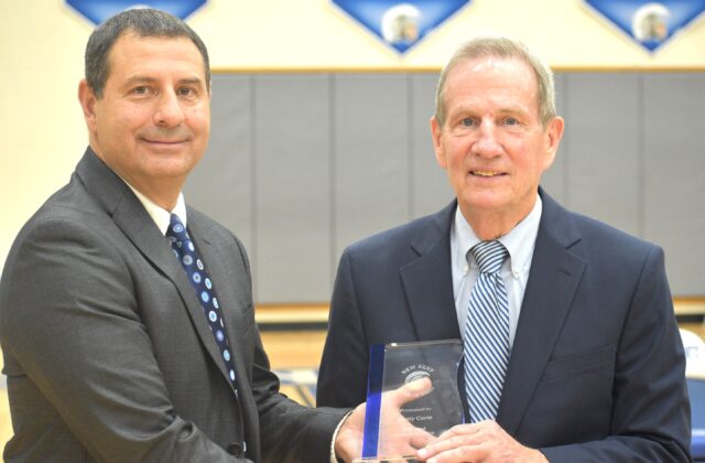 Rusty Curle, a 10-time letterman and only coach in New Kent history to be named as a District Coach of the Year in three sports, receives his recognition trophy as part of the 2026 New Kent High School’s Hall of Fame Class.Robb Johnson photos