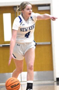 New Kent’s Delaney Montgomery directs traffic down the floor as she finishes the game with a double-double with 22 points and 10 steals.Robb Johnson photo