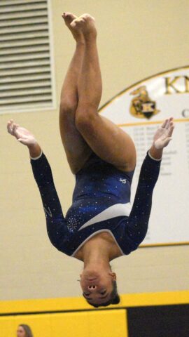 New Kent's Ryan Griffith executes a backflip as part of her dismount from the balance beam.Robb Johnson photo