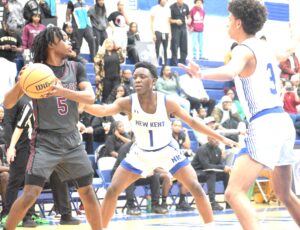 DSC_0982 By Andre Jones | February 27, 2026 1:41 am New Kent’s Joshua Reedy (1) and Rashad Leeper (3) apply double team defensive pressure against Heritage’s Mehki Watkins (5).Robb Johnson photo